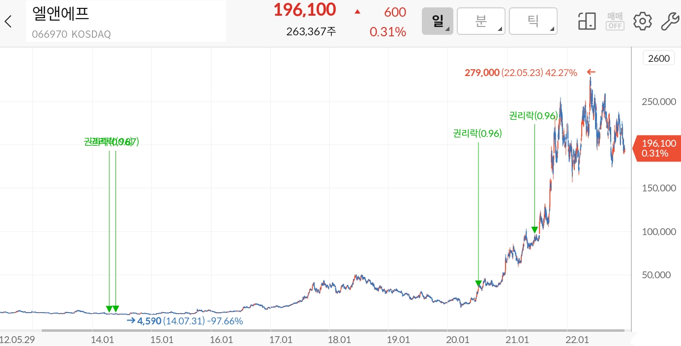 보시다시피 엘엔에프 주가가 급장하기 시작했고 그때는