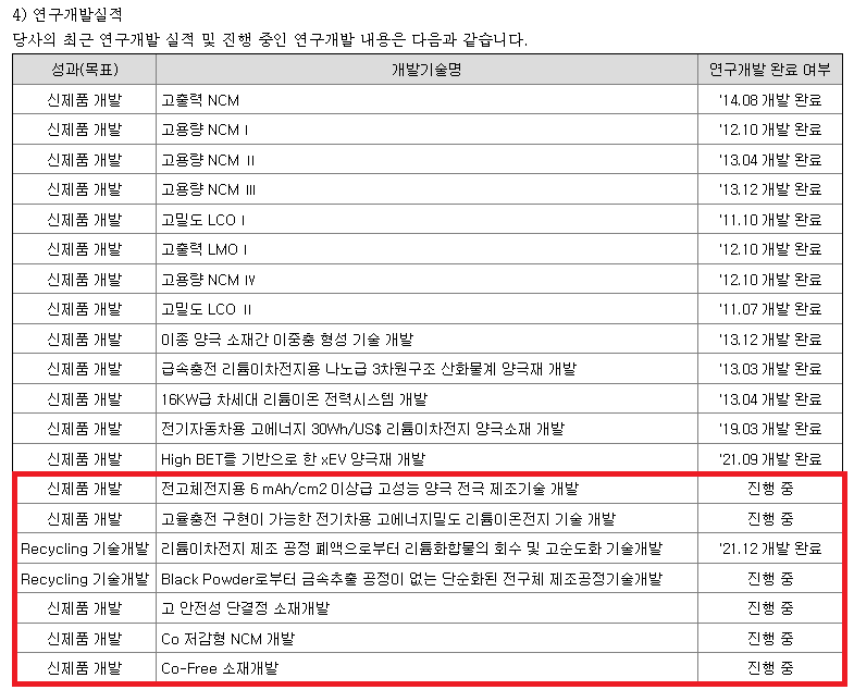 엘앤에프의 연구개발을 보면 꾸준한 개발이 이뤄지고 있다는 것을 알 수 있습니다.