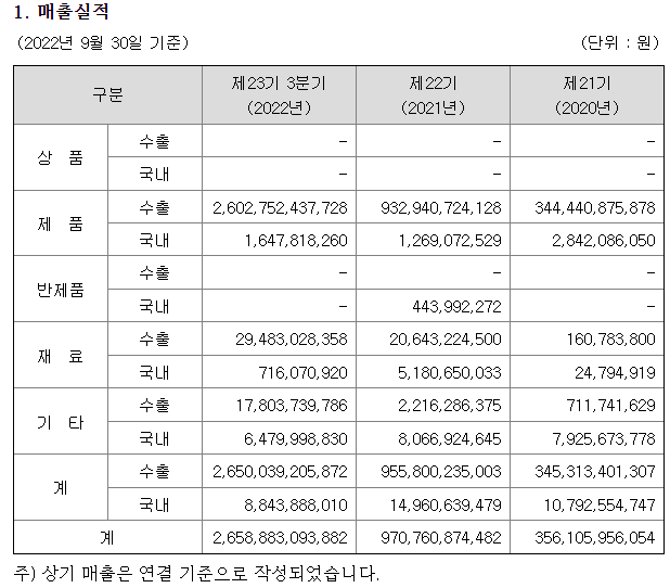 22년도 3분기 기준 전체 매출액 = 2조 6588억원입니다.
